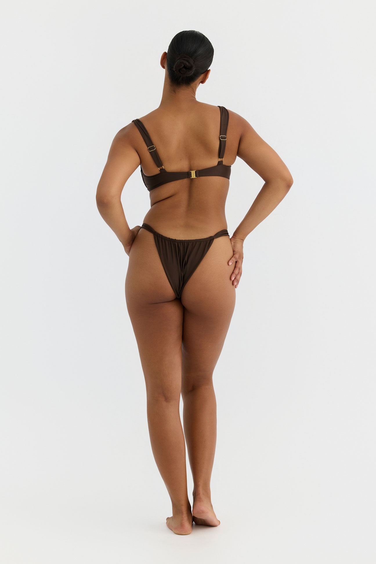 I love this top! The fit is so flattering and the fabric feels really soft. It stays in place perfectly and the chocolate color looks amazing on tanned skin. Highly recommend!
