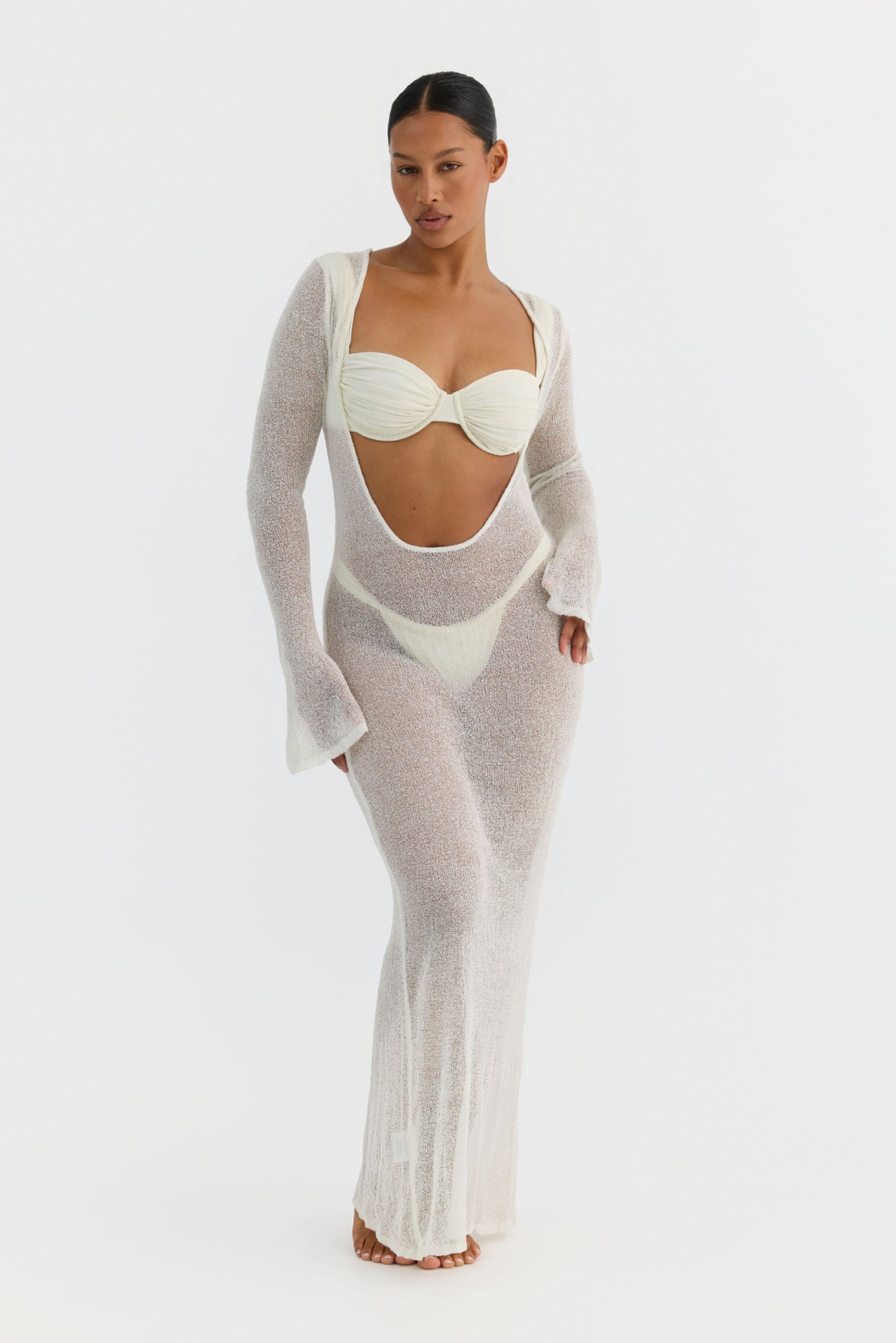 Our Athena dress in white features exaggerated sleeves that flare at the wrist, a relaxed neck line with a plunging back. Slightly fluted at the hem, the sophisticated Athena Maxi Dress is perfect for lounging poolside or for those late afternoon cocktails that turn into evening soirees.