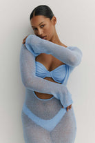 Our Athena dress in soft blue features exaggerated sleeves that flare at the wrist, a relaxed neck line with a plunging back. Slightly fluted at the hem, the sophisticated Athena Maxi Dress is perfect for lounging poolside or for those late afternoon cocktails that turn into evening soirees.
