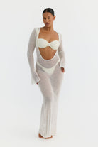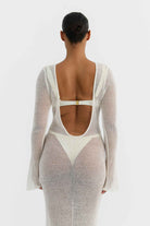 Our Athena dress in white features exaggerated sleeves that flare at the wrist, a relaxed neck line with a plunging back. Slightly fluted at the hem, the sophisticated Athena Maxi Dress is perfect for lounging poolside or for those late afternoon cocktails that turn into evening soirees.
