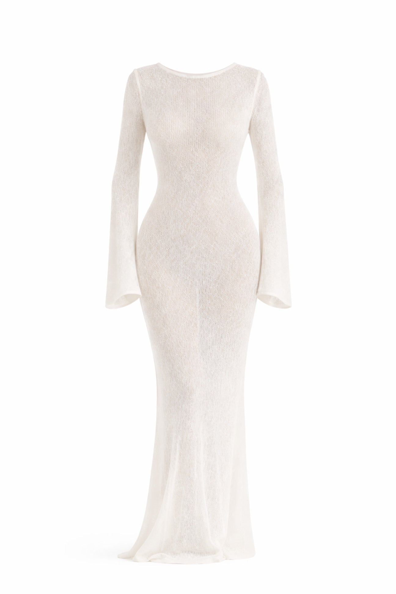 An evolved interpretation of our best-selling Athena dress, reimagined in a mid-weight open knit with a fluid, elongated silhouette. Defined by softly flared sleeves, a fluted hem and a sculpted low back, she drapes with ease over the body.