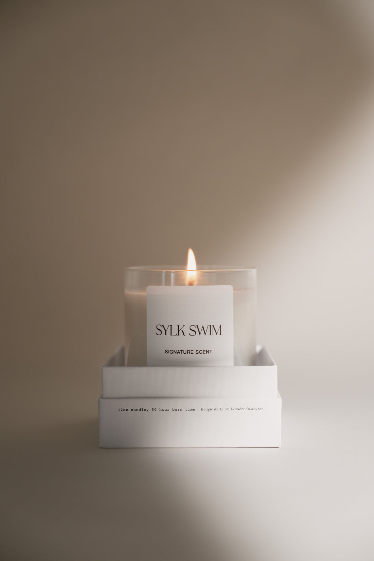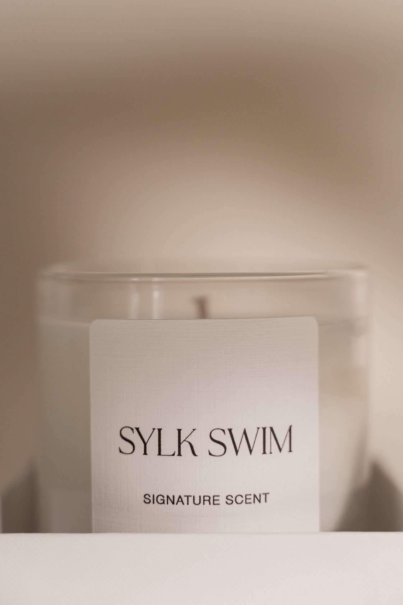 Sylk Swim's hand-poured Signature Candle, brings a refined, coastal inspired ambience to any space. Infused with Sylk Swim's elevated aesthetic, the candle is housed in an elegant glass vessel and comes beautifully packaged in a premium gift box. With notes of amber and sandalwood, it is the perfect luxe addition to your home or the perfect gift.